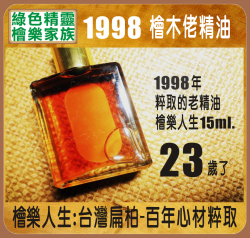 。稀有樹種:台灣扁柏(HINOKI) 非紅檜(BENIHI)。 。萃取年份:1998年萃取存放至今的純化老精油。 。現存油量:1998年製成,售完為止。